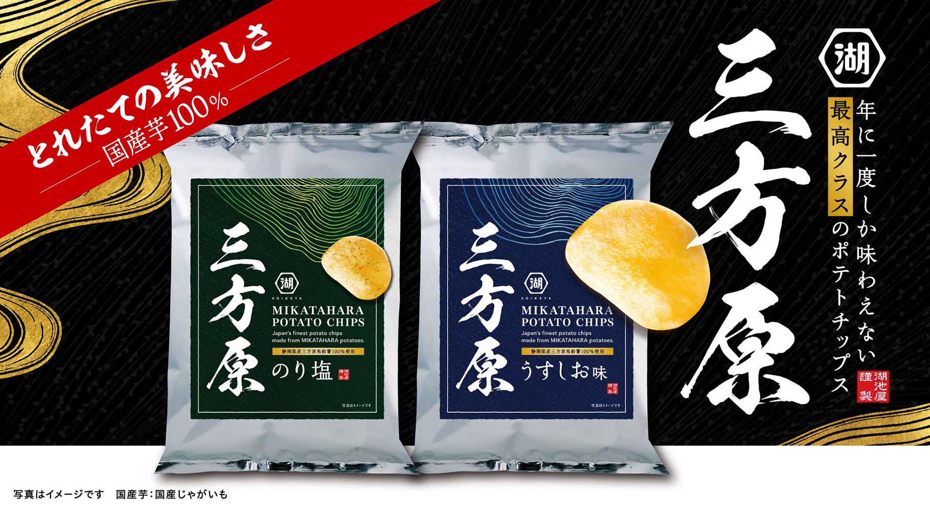 株式会社湖池屋(社長:佐藤章)は、とぴあ浜松農業協同組合の全面協力のもと、静岡県が誇る高級ブランドじゃがいも“三方原馬鈴薯”を100%使用した「三方原ポテトチップス うすしお味」、「三方原ポテトチップス のり塩」を2025年6月25日(水)より湖池屋オンラインショップにて販売開始します。