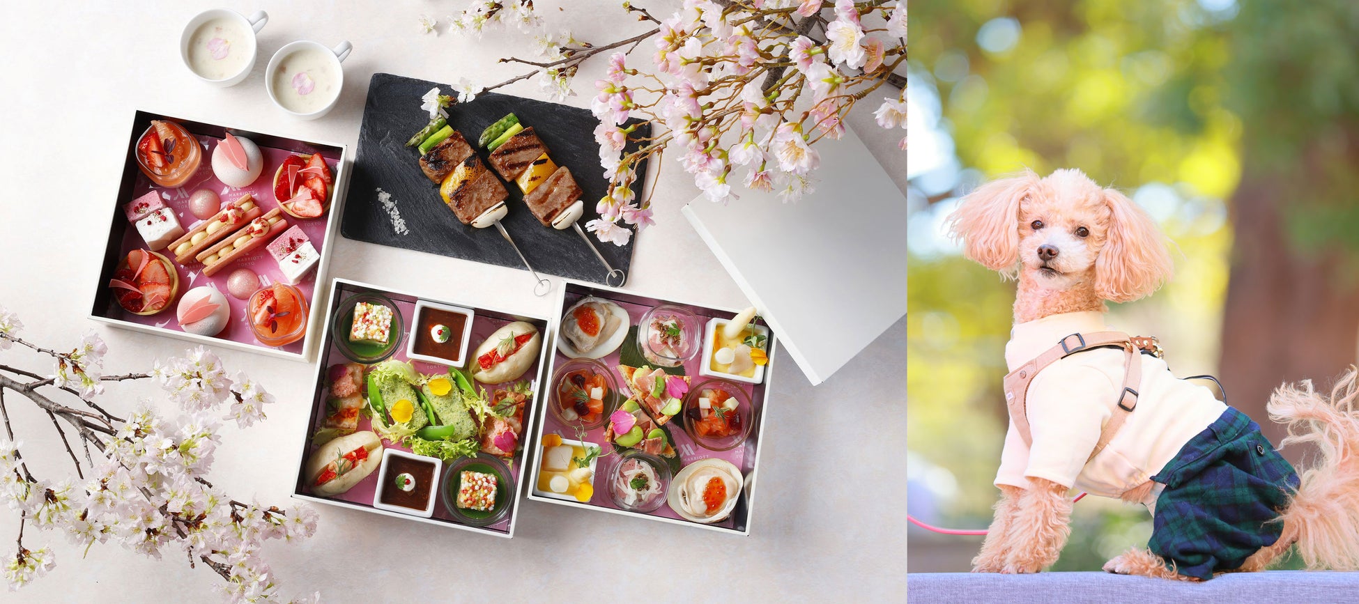 例年ご好評の葛飾北斎の浮世絵にも描かれた美しい名所、品川・御殿山にて、愛犬とのお散歩やテラスランチ、プロカメラマンによる撮影会をお楽しみいただける当イベント。犬種別犬籍登録頭数ランキングが15年連続でトイプードルということから4月10日(木)をトイプードル限定の日、4月11日(金)を全犬種対象の日に設定し、愛犬の撮影だけでなく、同じ犬種を飼っている人との交流を深めたい方にもお楽しみいただけるよう開催いたします。ランチは、旬の春食材がご堪能いただけるお重スタイルの「GOTENYAMA SAKURA BOX(ゴテンヤマ サクラ ボックス)」を、テラスにてフリーフローのドリンクと合わせてご用意。ハマグリのマリニエールや、鮮やかなあられをまとったサワラの西京焼きに加え、国産牛サーロインと旬の春野菜のグリルをお楽しみいただけます。愛犬のご飯には、無添加・無着色・保存料不使用のメインを選べるお食事プレートを販売。春の日差しが降り注ぐテラスで愛犬と一緒にランチタイムをお過ごしいただけます。また、昨年に続き、愛犬と泊まれるホテルの予約サイト「My Shippo(マイ シッポ)」とコラボレーションし、愛犬のお写真をより華やかに収められるフォトスポットもご用意しております。