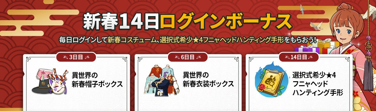 イベント期間中にゲームにログインすることで、「異世界の新春帽子ボックス」や「異世界の新春衣装ボックス」、「選択希少★4フニャヘッドハンティング手形」などの豪華報酬を獲得できます。