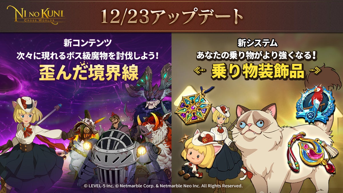 ネットマーブルは、レベルファイブとタッグを組みスマートフォン向けに開発したファンタジーアートRPG『二ノ国:Cross Worlds』(略称:ニノクロ)において、本日12月23日(木)にゲームアップデートを実施し、新コンテンツ「歪んだ境界線」や新システム「乗り物装飾品」を追加した他、エピソード「幸せを運ぶ聖なる木」の第2弾コンテンツを開放したことをお知らせいたします。