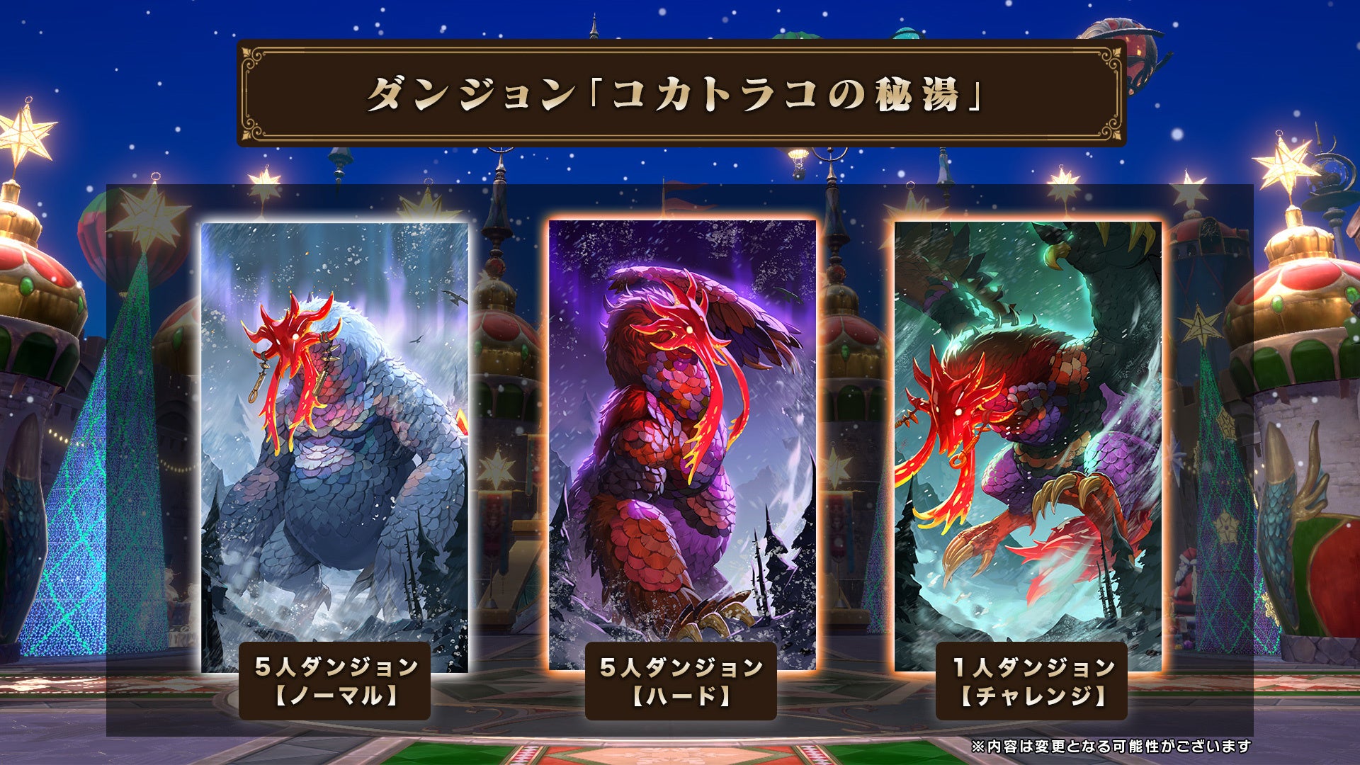 新エピソードクエストの開放に加え、温泉コカトラコと戦うイベントダンジョンでは、1人ダンジョンに「チャレンジ」、5人ダンジョンに「ハード」の新難易度を開放いたしました。