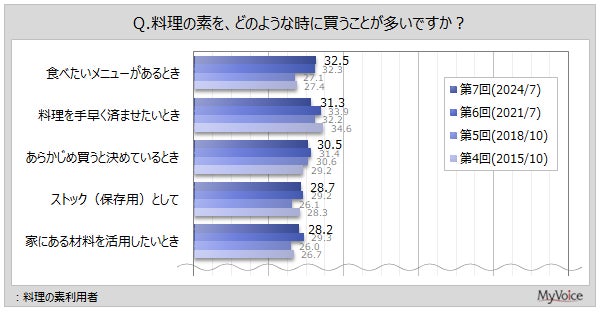 【料理の素に関する調査】料理の素を購入する場面は「食べたいメニューがあるとき」「料理を手早く済ませたいとき」「あらかじめ買うと決めているとき」が利用者の各3割強