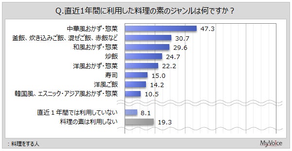 利用したジャンルは(複数回答)、「中華風おかず・惣菜」が47.3%、「釜飯、炊き込みご飯、混ぜご飯、赤飯など」が30.7%、「和風おかず・惣菜」「炒飯」「洋風おかず・惣菜」が各20%台です。