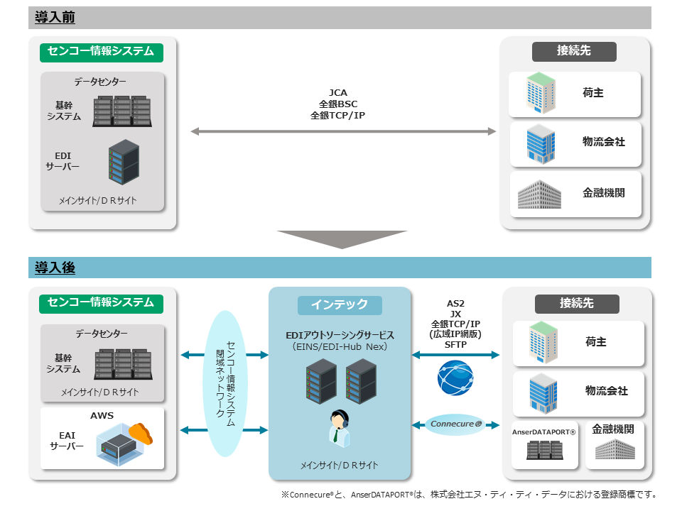 センコー情報システムは、これらの課題を解決するため、EDIサービスにおける豊富な運用実績、コストパフォーマンス、障害発生時のコンサルティングなど、トータルとして充実した運用サポートを受けられる点、DR※1サービスによる盤石なBCP対策が可能である点を評価し、インテックの「EDIアウトソーシングサービス」の採用を決定しました。