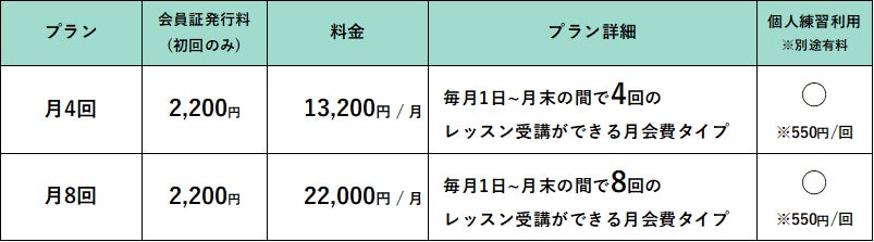 予約専用サイトより、ご希望のレッスン日時をご予約いただく完全予約制です。予約時間の1時間前までお客様ご自身で予約専用サイトからキャンセルが可能で、急な用事などが入ってしまった場合も1回分の費用を消化することなくキャンセル対応が可能で安心です。また、各人の通いたいペースにあわせて、月4回、月8回のプランをお選びいただけます。月の利用回数を超えてご利用されたい場合は1回あたり3,850円をお支払いいただければ追加での受講が可能です。