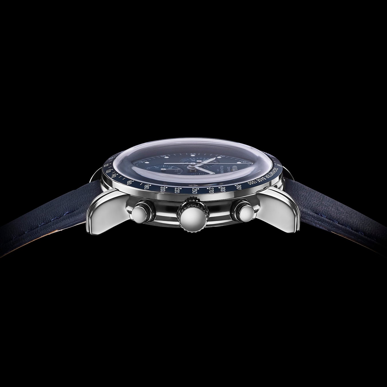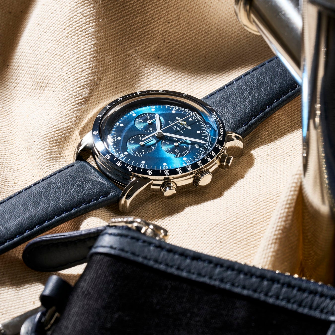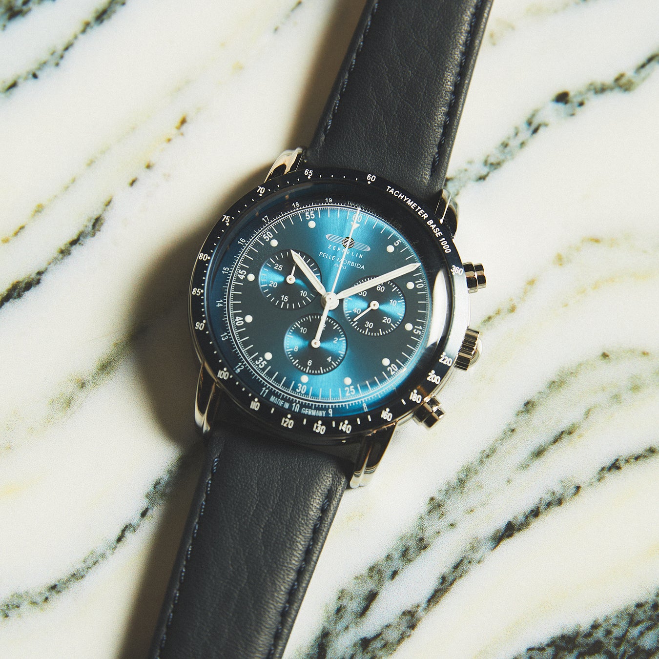 12時位置には「ZEPPELIN」と「PELLE MORBIDA」のダブルネームがデザインされていいます。また、2時位置に秒針・6時位置に12時間計・10時位置に30分計のインダイヤルを配置。深みのあるブルーのベゼルには平均速度を換算表示できるタキメーター、ダイヤルの外周には光と音の速度差を利用して距離計測ができるテレメーターを装備しました。