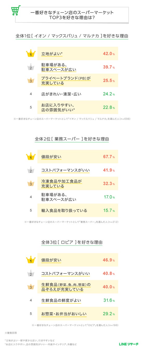 LINEリサーチ、全国の15~69歳の男女を対象に、一番好きなチェーン店のスーパーマーケットに関する調査を実施