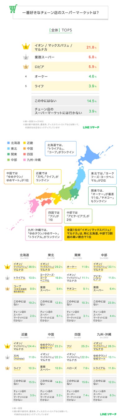 【LINEリサーチ】一番好きなチェーン店のスーパーマーケット全国1位は「イオン/マックスバリュ/マルナカ」で2割超!地域別の傾向は?