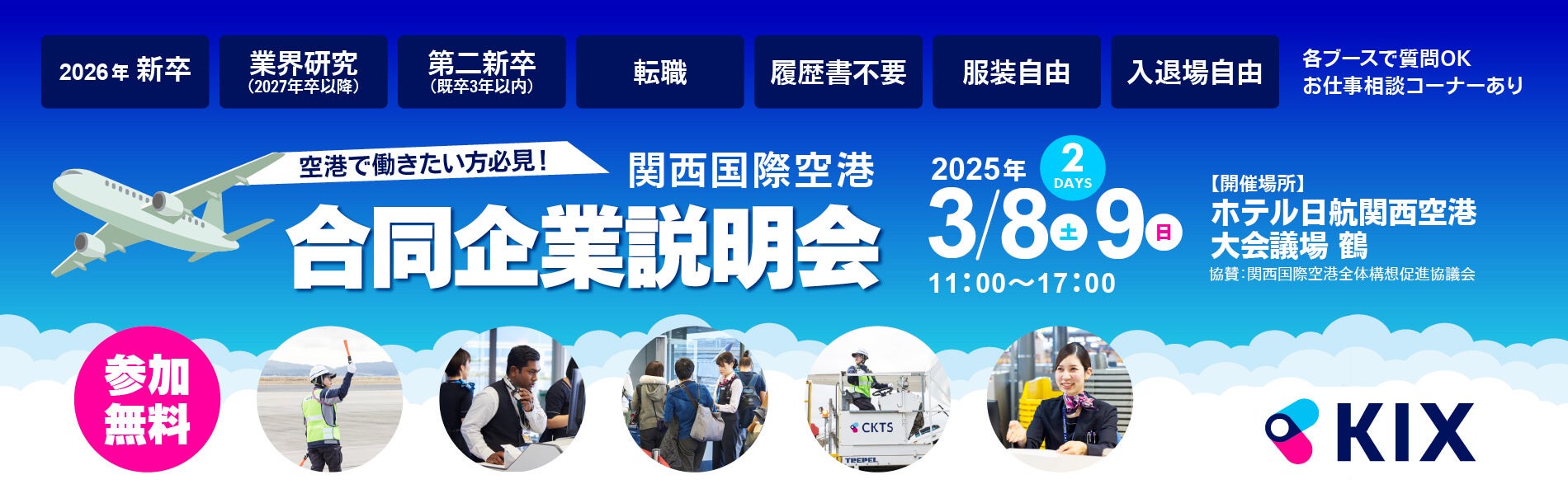 関西国際空港で日々活躍している航空・空港事業者が集まり、2026年卒、2027年卒以降、第二新卒、転職者(業界未経験者含む)採用を対象とした合同企業説明会。2日間で空港関連会社36社が参加を予定しています。採用担当者と直接会話をすることで、応募の前に各事業者の仕事内容や条件等の詳細を質問・確認できます(選考を行う場ではありません)。 服装自由、履歴書不要、会場の出入りも自由にできます。エアラインや航空・空港関連の会社を志望もしくは興味のある方は、この機会に是非ご参加ください。 |