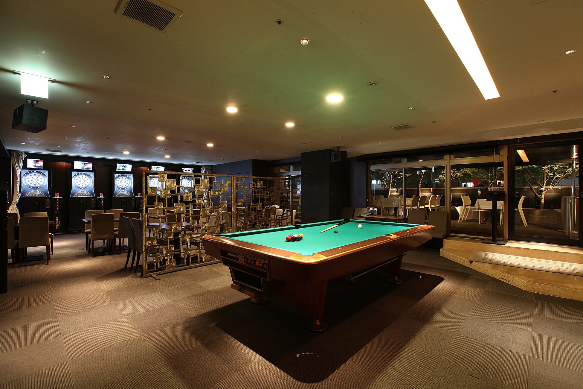 赤坂見附駅から徒歩1分。ビリヤード、ダーツ、カラオケ、シミュレーションゴルフと2フロアのテラス席を完備したアミューズメント&シーズンダイニング。春には桜、秋は紅葉と、シーズンごとに季節感を愉しめるテラス席が人気です。ルーフ付きなので天候を気にせずご利用可能。VIPテラス席はカラオケ&ダーツ個室が一緒にご利用いただける、当店自慢のプライベートスペースです。親しいお仲間だけでアミューズメントBBQはいかがでしょうか。BBQでお腹を満たした後は、ビリヤード、ダーツ、カラオケ、シミュレーションゴルフで二次会を。気の合う仲間と食べて飲んで語り合う、大切な時間を演出致します。