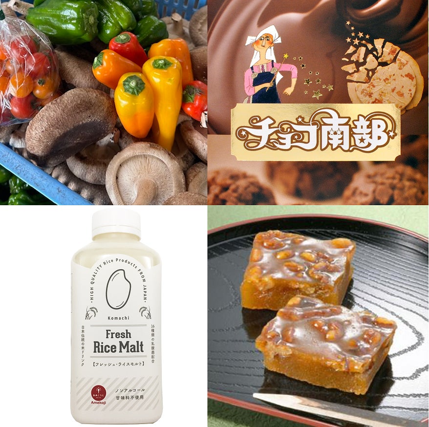 左上:神栖市の野菜 右上:二戸市 チョコ南部 左下:大潟村 乳酸菌入り甘酒 右下:郡山市 くるみゆべし