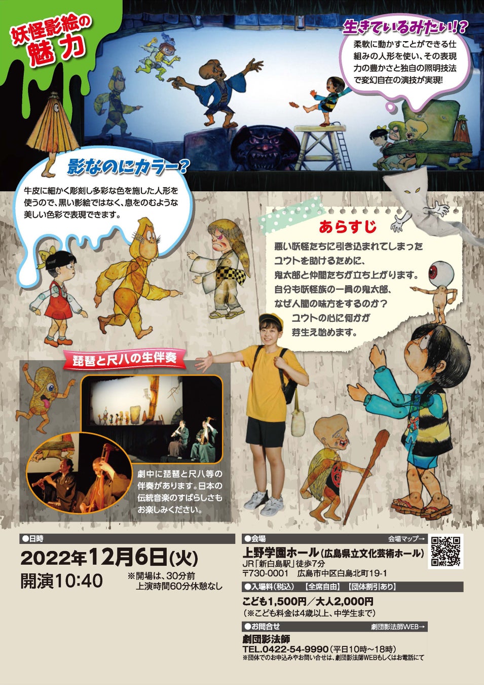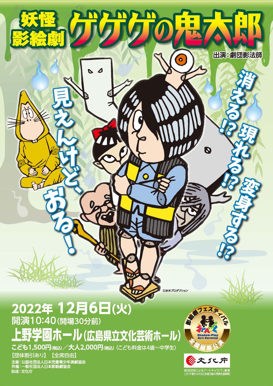 株式会社劇団影法師 妖怪影絵劇「ゲゲゲの鬼太郎」【広島公演】が2022年12月6日 (火)に上野学園ホール(広島県立文化芸術ホール)(広島県広島市中区白島北町19-1)にて上演されます。