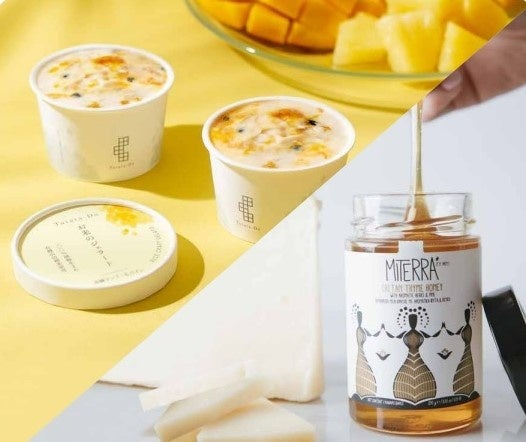 写真左)「ハニーマザー」お米のジェラート〈沖縄マンゴー&パイン〉(100ml)540円