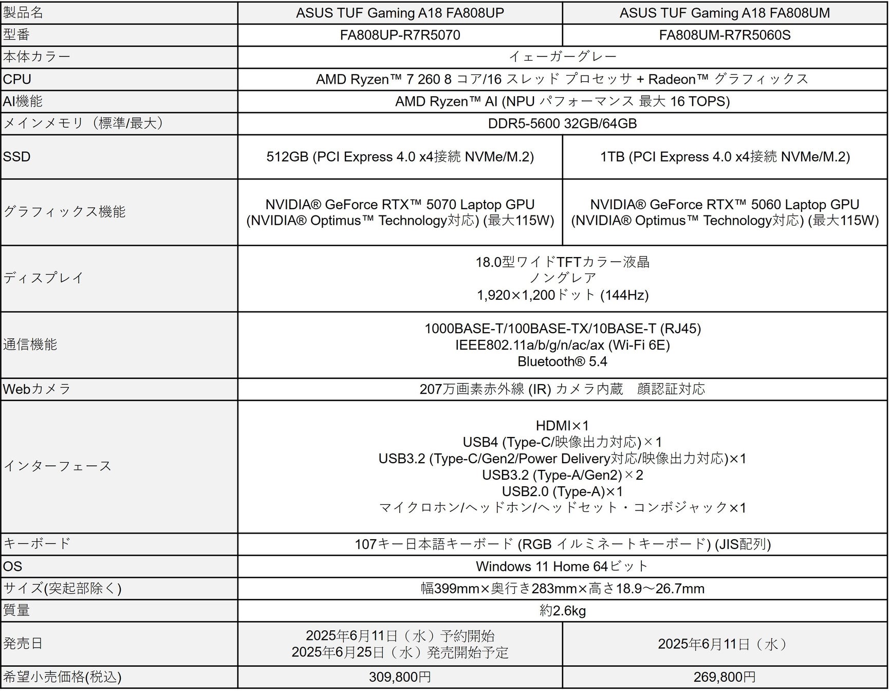 ASUS JAPAN株式会社は、ASUSのゲーミングシリーズ「ASUS TUF Gaming」より、新しいGPU、NVIDIA® GeForce RTX™ 5070 / 5060 Laptop GPUを搭載した、「ASUS TUF Gaming A18 FA808UP / FA808UM」、「ASUS TUF Gaming A16 FA608PP / FA608PM / FA608UM」、「ASUS TUF Gaming F16 FX608JPR / FX608JMR」、「ASUS TUF Gaming A14 FA401KM / FA401UM」の4製品10モデルを発表いたしました。本日より順次発売開始となります。