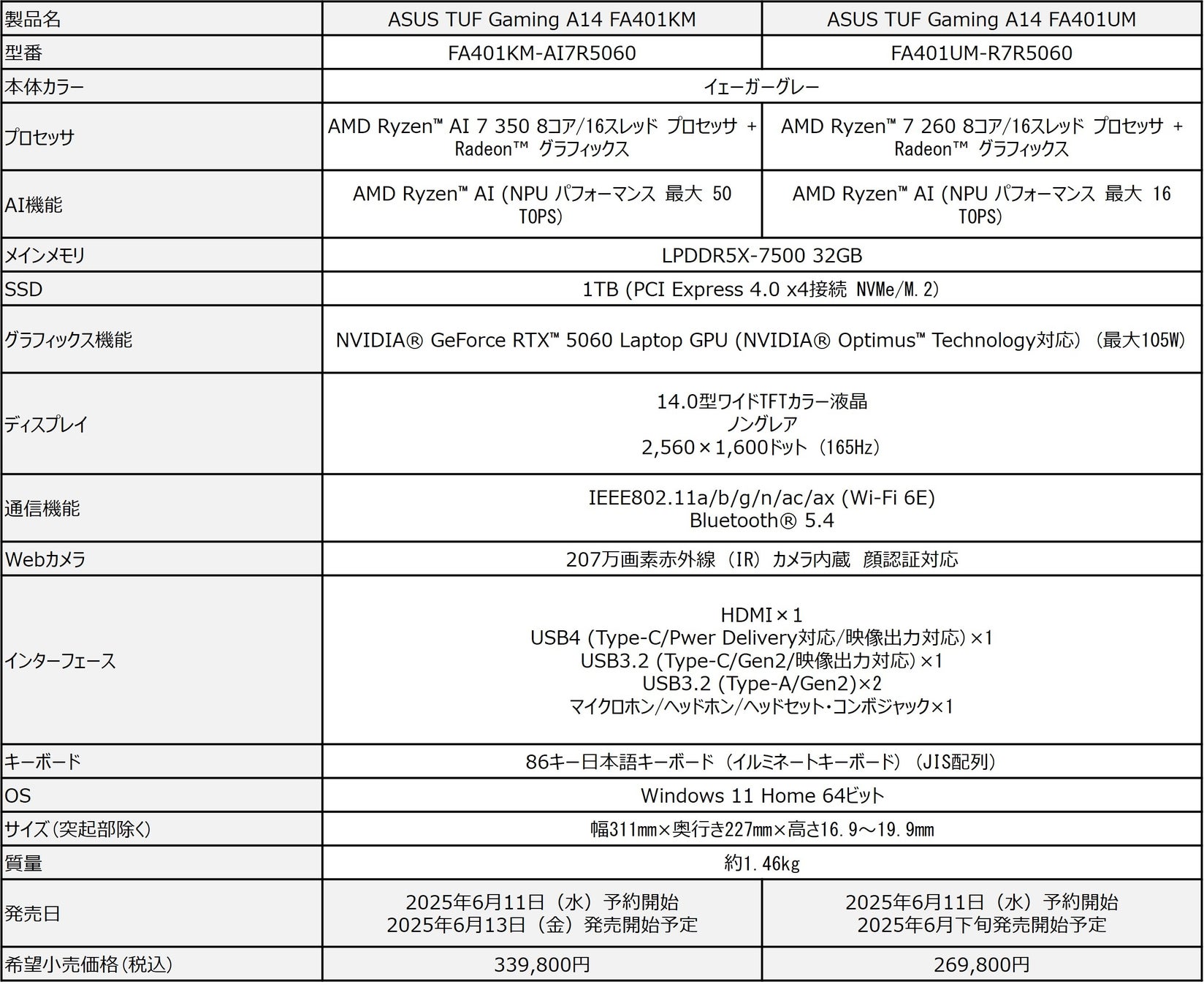 「ASUS TUF Gaming A14 FA401KM / FA401UM」は、持ち運びにも最適で、リフレッシュレート165Hz対応の14型ディスプレイを搭載しており、NPUパフォーマンス最大50TOPSの「AMD Ryzen™ AI 7 350プロセッサー」、または、NPUパフォーマンス最大16TOPSの「AMD Ryzen™ 7 260プロセッサー」を搭載し、NVIDIA® GeForce RTX™ 5060 Laptop GPUを搭載しています。