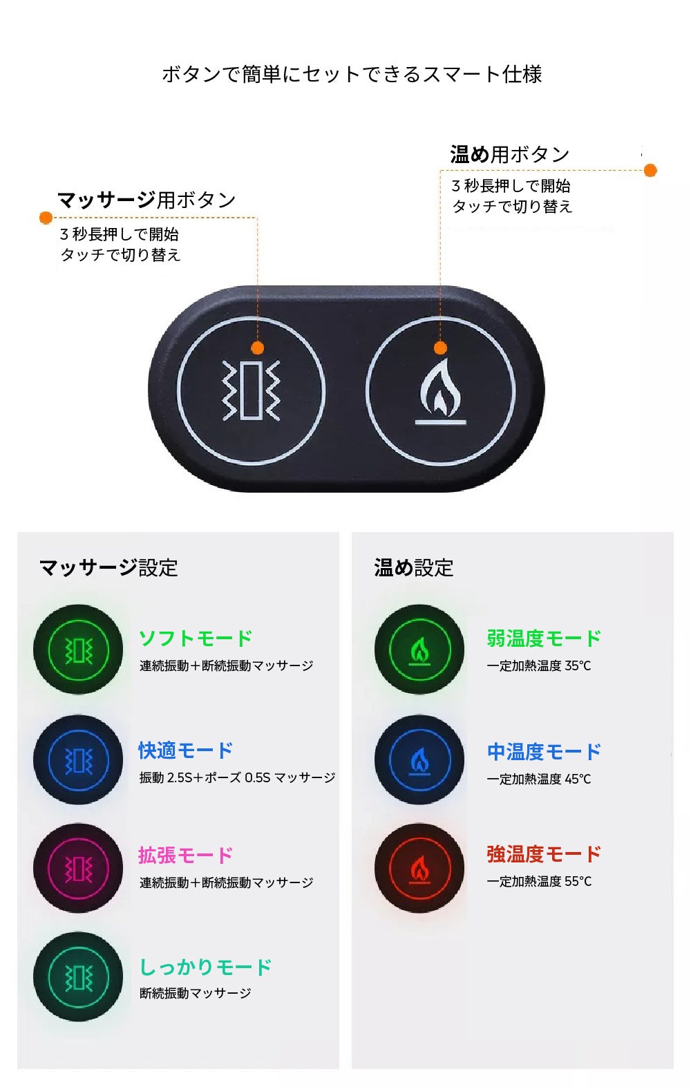 温め、マッサージのボタンが各一つ、ワンタッチで使いたい用途・レベルに合わせて簡単に設定できます。