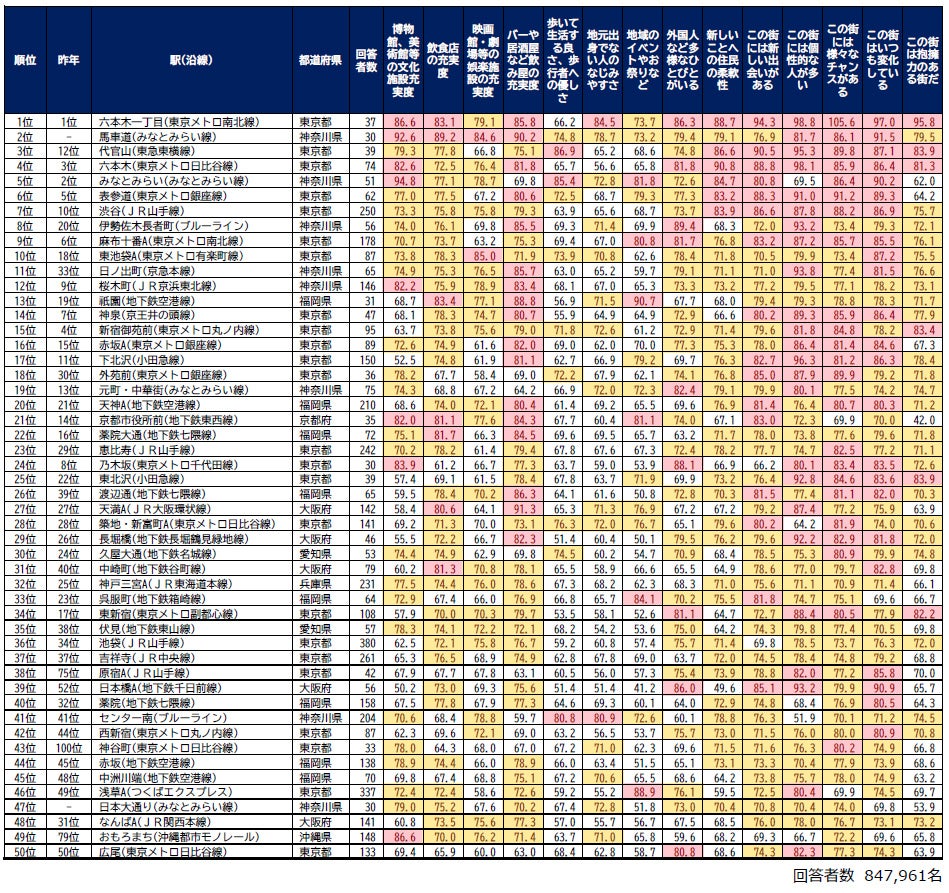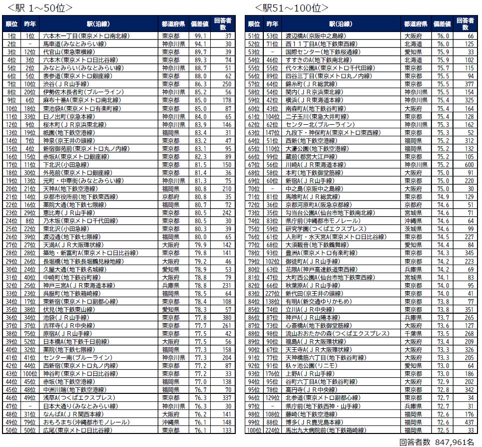 ●トップ100で今回初登場の駅は、47位日本大通り(神奈川県)、53位国際センター(愛知県)、70位中之島(大阪府)、97位県庁前(兵庫県)で、いずれも昨年は累計回答者数が30名未満でランキングの集計対象外でした。