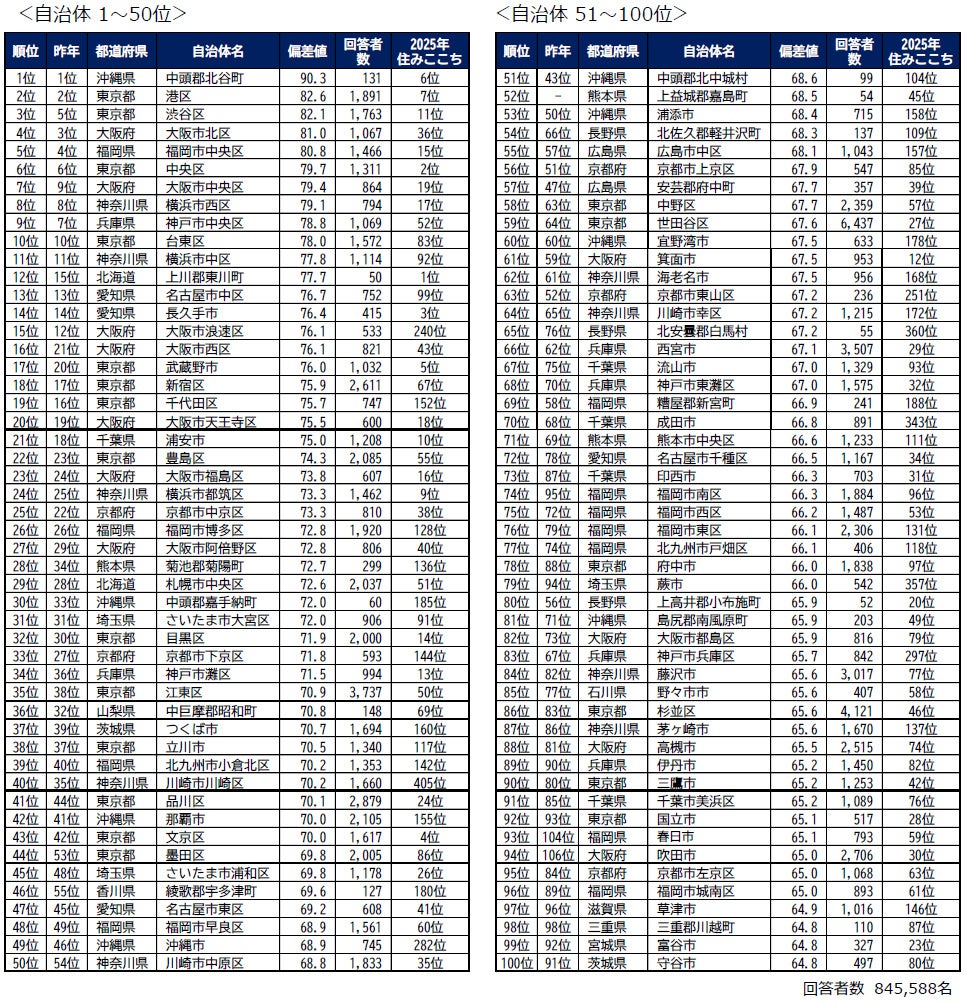 ※表内に記載している「住みここち」は、2025年8月6日に発表している「住みここちランキング<全国版>」の順位を記載しています。詳しい順位はWEBサイトをご参照ください。