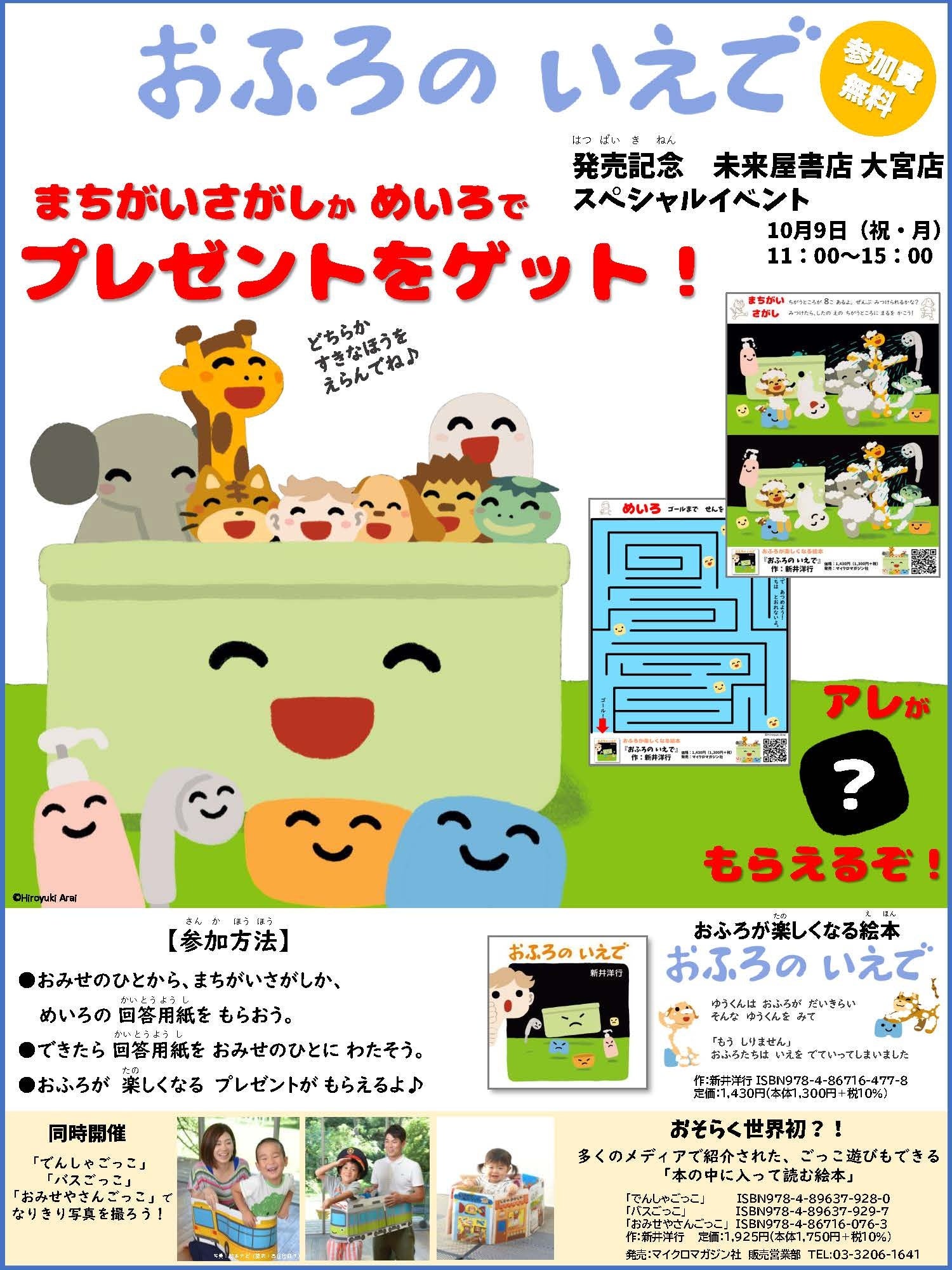 新井洋行先生の新作絵本『おふろの いえで』の発売を記念したスペシャルイベントを、10月9日(祝・月)に未来屋書店大宮店にて開催いたします。