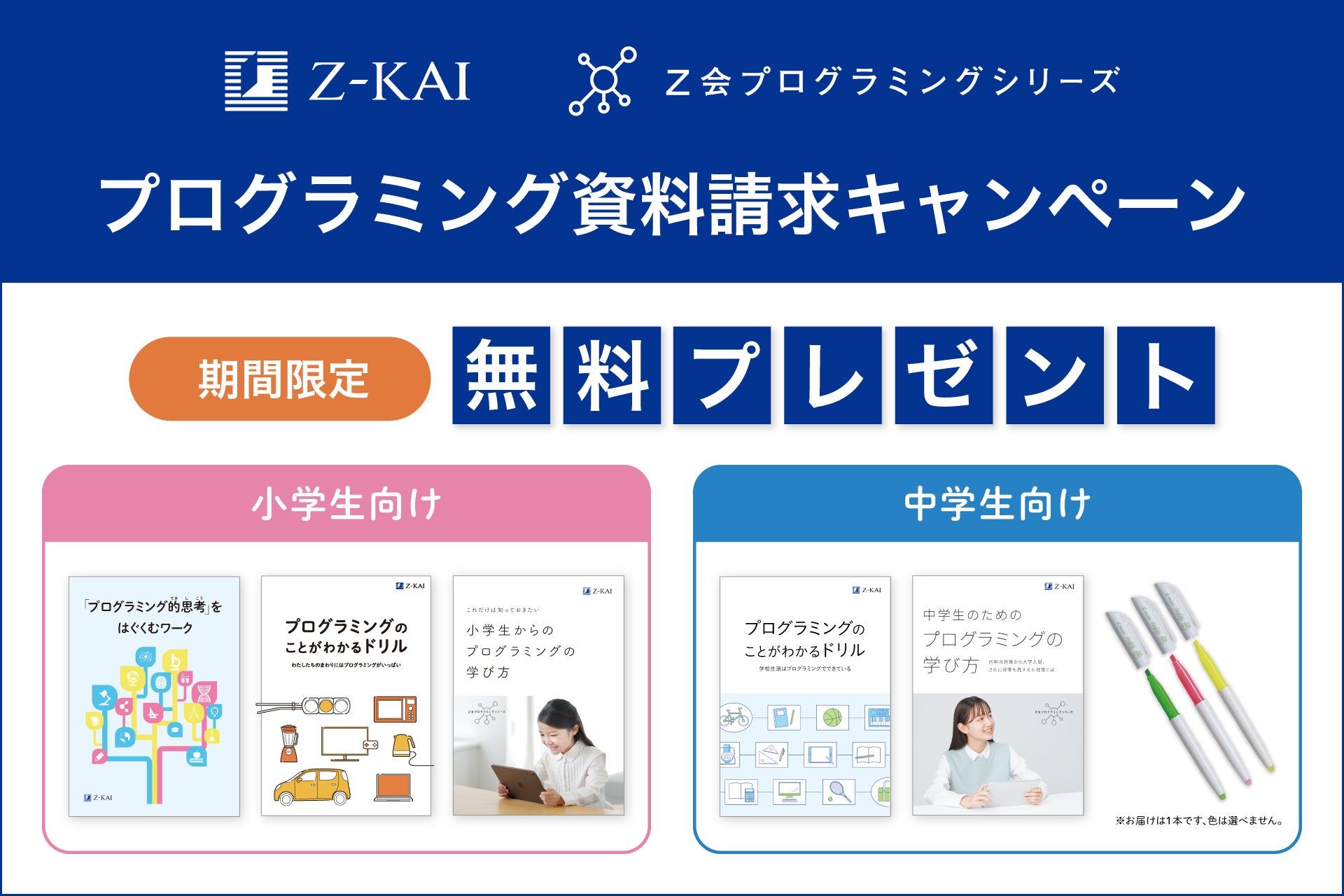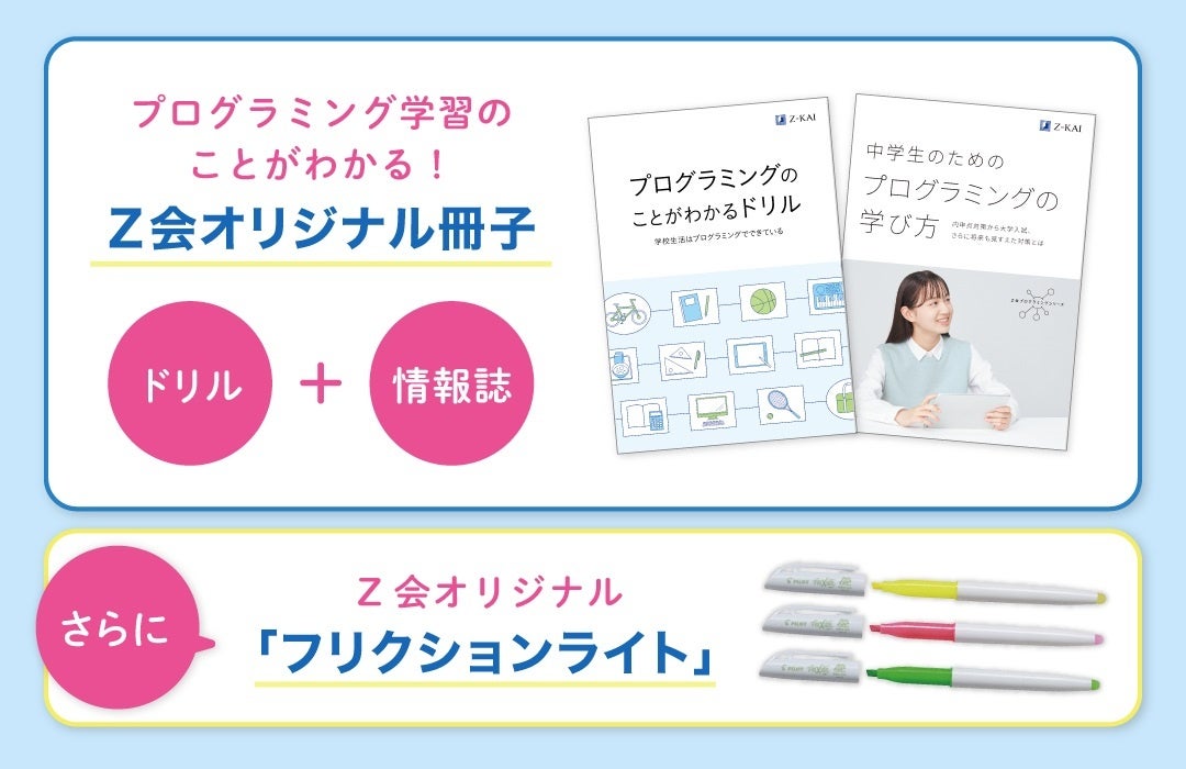 株式会社増進会ホールディングス(Z会グループ)のグループ会社である株式会社Z会は、プログラミング学習を始めたいお子さまと保護者のみなさまを応援するため、資料請求キャンペーンを2026年1月12日~3月31日の期間限定で実施いたします。キャンペーン期間中に「Z会プログラミングシリーズ」の資料をご請求いただいた方全員に、プログラミング学習のことがわかるZ会オリジナルの冊子とグッズを無料でプレゼントします。