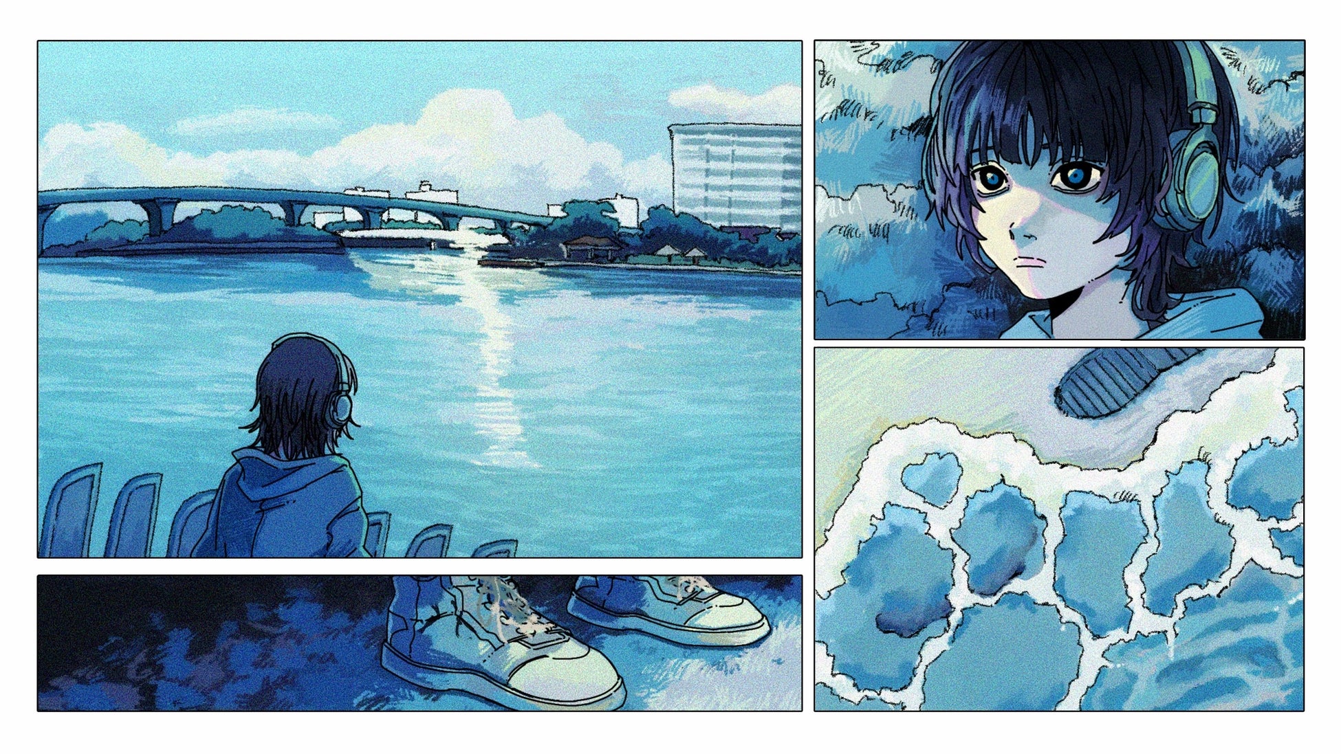そこで⾒た⾵景や、起こりうるストーリーとか、まだ形になりきれない夢や感情を海の⻘さに重ねた楽曲です。