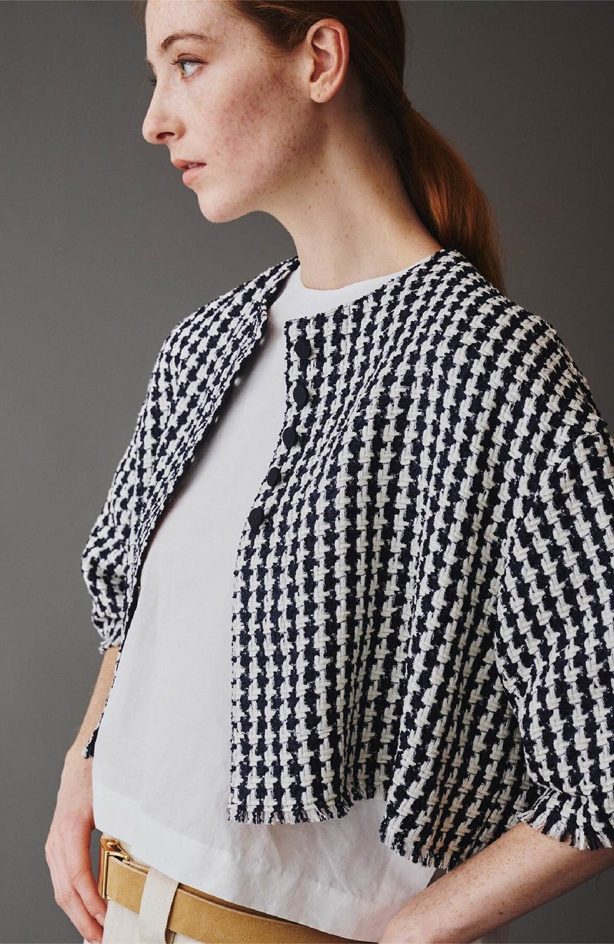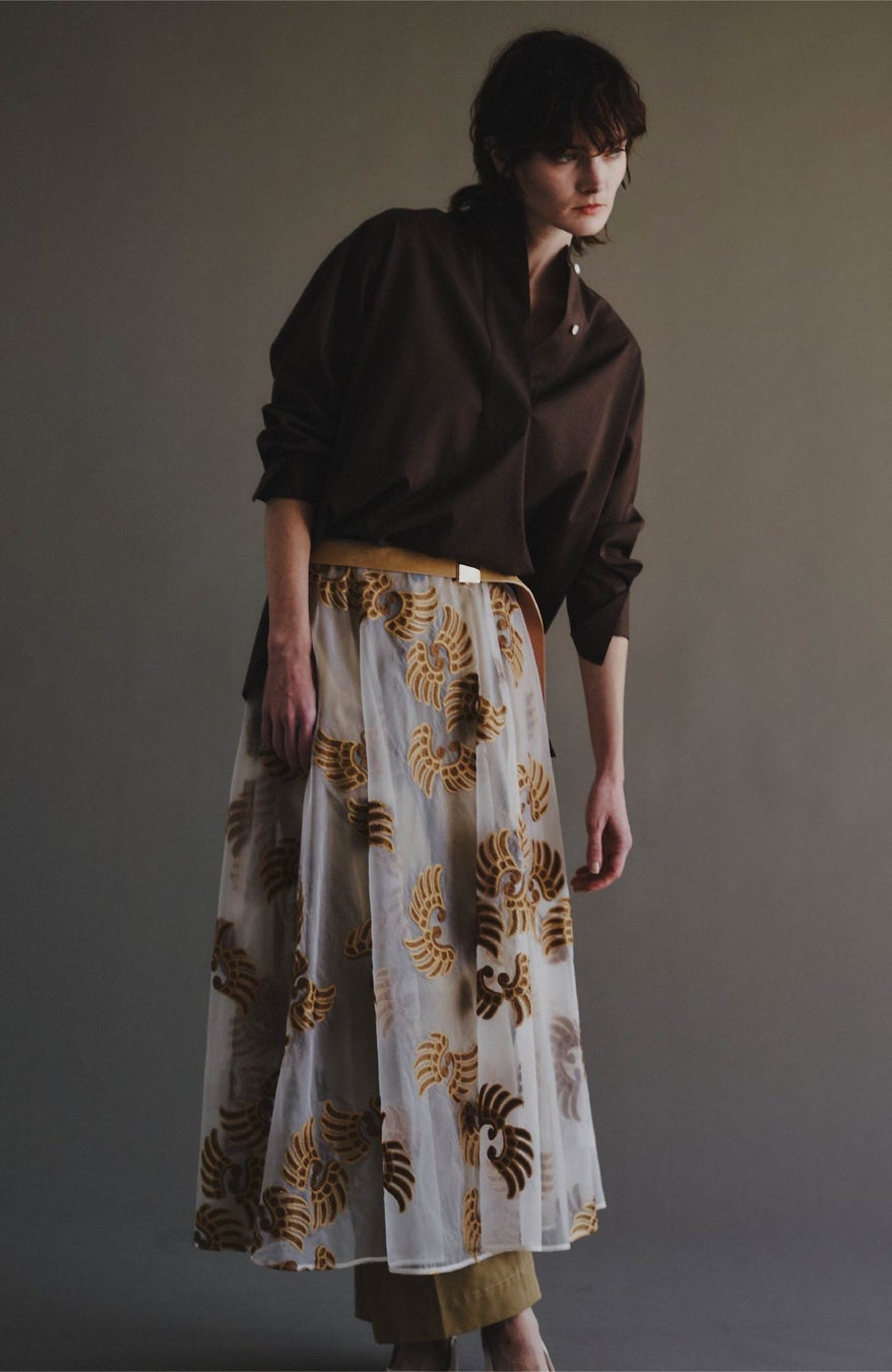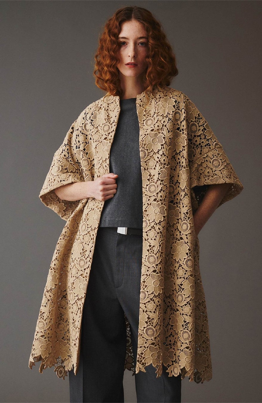 立体感のある刺繍で表現されたオリジナルのフラワーモチーフをケミカルレースで表現したトッパーコート、透明感のある軽やかなオーガンザにインドVENTURES社のオリエンタルなフェザーモチーフを刺繍したフレアスカート、イタリアFERLA社の甘織りで織られたハウンドトゥース柄を用いたクロップドジャケットなど、拘りのラグジュアリー素材を使ったコレクションを実際に手に取りご覧いただけます。また、艶感と軽さが特徴のイタリア製のリリアンテープ糸を使ったスポンディッシュな質感とクロップド・シルエットが際立つカーディガン、表情のあるリネンコットンが甘さを感じさせない独特のシルエットが魅力的なディドレス、イタリアシャツ地メーカーALBINI(アルビニ)社のリネン素材を使った深いVネックがシャープなプルオーバーシャツなど、春から夏へ向けて活躍するアイテムもラインナップいたします。