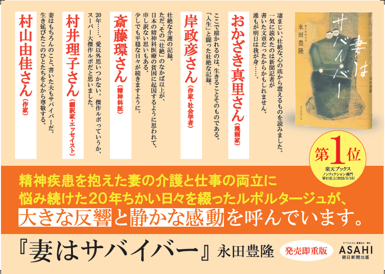 発売直後から「壮絶すぎる」と大きな反響と、静かな感動が広がり、発売3カ月で4刷となっている『妻はサバイバー』(永田豊隆著)が、書店員の方たちが読んでほしいと思う作品を投票で選ぶ「2022年 Yahoo!ニュース|本屋大賞 ノンフィクション本大賞」の最終候補6作品にノミネートされました。