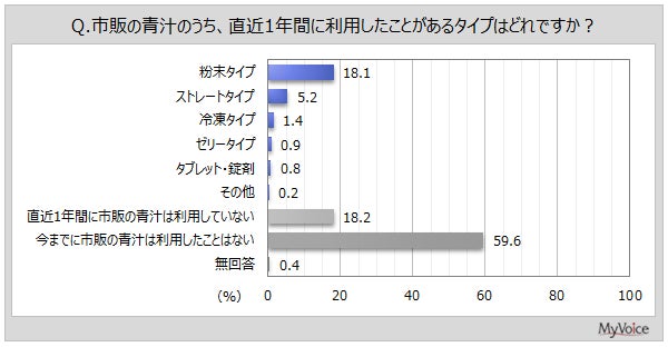 青汁の利用経験者は4割で、直近1年間に利用した人は2割強です。