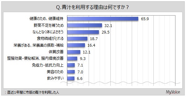 直近1年間に青汁を利用した人の利用理由は(複数回答)、「健康のため、健康維持」が65.9%です。「野菜不足を補うため」「なんとなく体によさそう」が3割前後、「食物繊維がとれる」「栄養がある、栄養素の摂取・補給」「体質改善」が各10%台となっています。