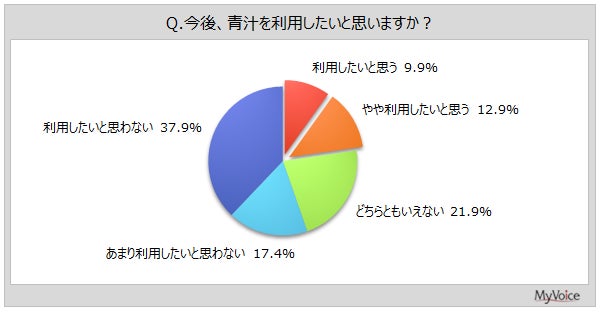 青汁の利用意向者は、「利用したい」「やや利用したい」を合わせて2割強です。男性では2割弱、女性では3割弱となっています。