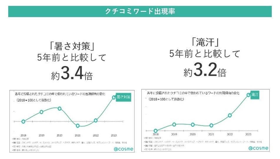 ユーザーアンケートでは、全体の約88%が「自分の考えや気持ちに当てはまるもの」として「年々、夏が長くなっていると感じる」と回答し、生活者の多くが夏の長期化を実感している結果となりました。クチコミでも、「暑さ対策」のワードの出現率が5年前と比較して3.4倍、「滝汗」も3.2倍となっており、ここ数年で「暑さ」への意識が高まっていることが見てとれます。