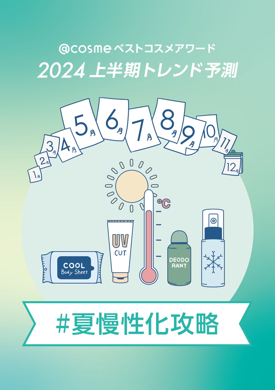 コスメ・美容の総合サイト「アットコスメ」を運営するアイスタイルは、2024年上半期の美容トレンド「@cosmeベストコスメアワード2024上半期トレンド予測」において、ヘルスケア・化粧品業界が注目する美容トレンドとして「#夏慢性化攻略」というキーワードを発表しました。2024年は、従来「夏限定」のイメージが強かった「ひんやりアイテム」や夏定番の悩みである「テカリ」や「湿気」対策、夏に気になる「臭い・汗ケア」アイテムに、夏を迎える前から生活者の関心が高まると予測されています。