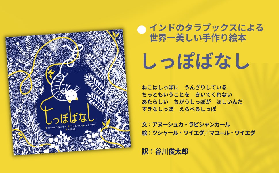 一つ一つを手作りで製本するアートな絵本として、世界中から注目を集めているインド・チェンナイにある出版社タラブックスの絵本。この度、子どもたちとも一緒に楽しめる絵本『しっぽばなし』の日本語訳を刊行しました。ワルリ族にルーツをもつ芸術家、ワイエダ兄弟により、自然や生きものを繊細なタッチで表現。日本語訳には、谷川俊太郎氏を迎え珠玉のことばでお届けします。※シリアルナンバー入り
