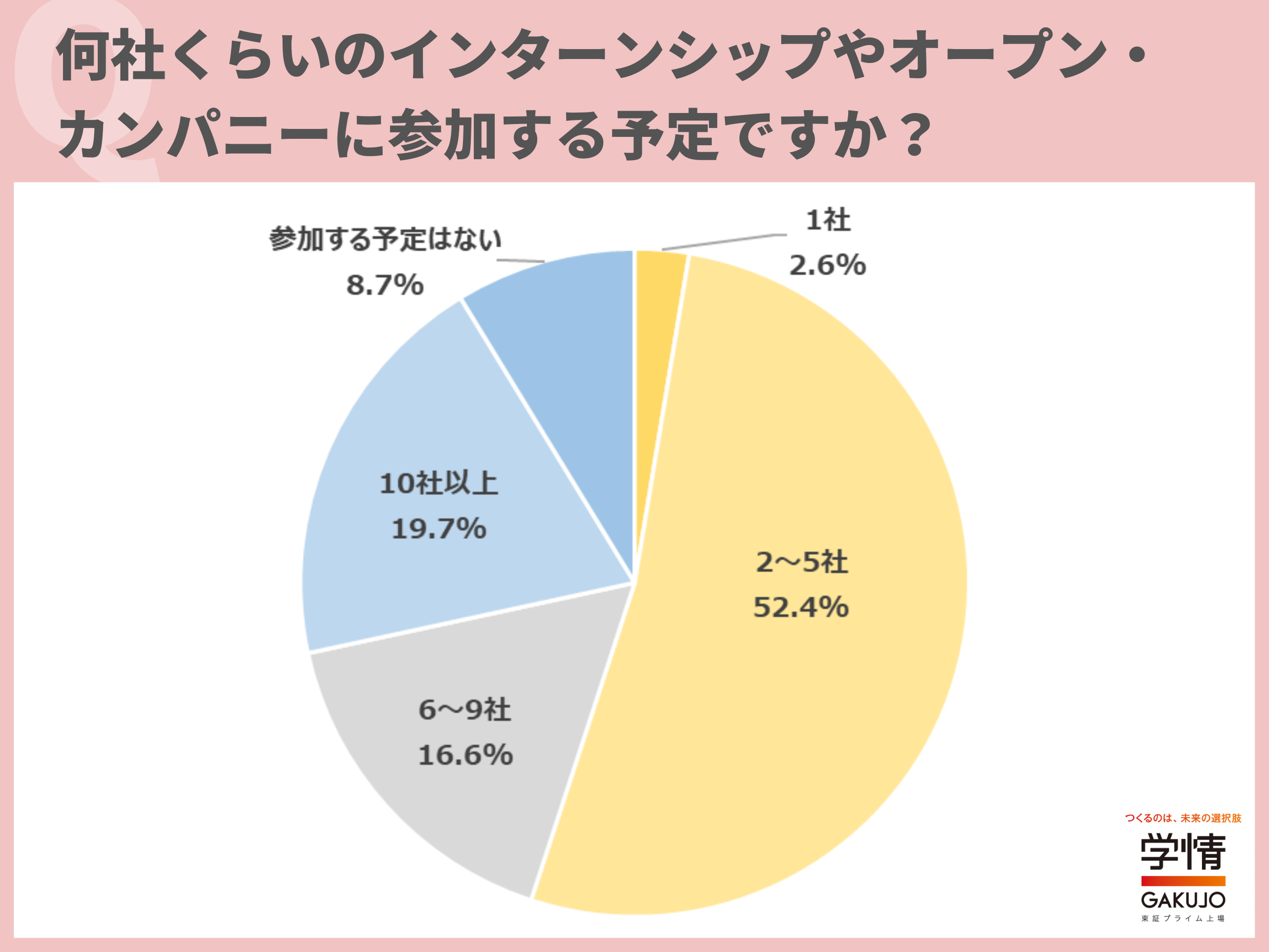 何社くらいのインターンシップやオープン・カンパニーに参加する予定かを尋ねたところ、「2~5社」が52.4%で過半数を占めて最多でした。次いで「10社以上」が19.7%で2割近く、「6~9社」の16.6%が続き、「参加する予定はない」との回答は8.7%でした。