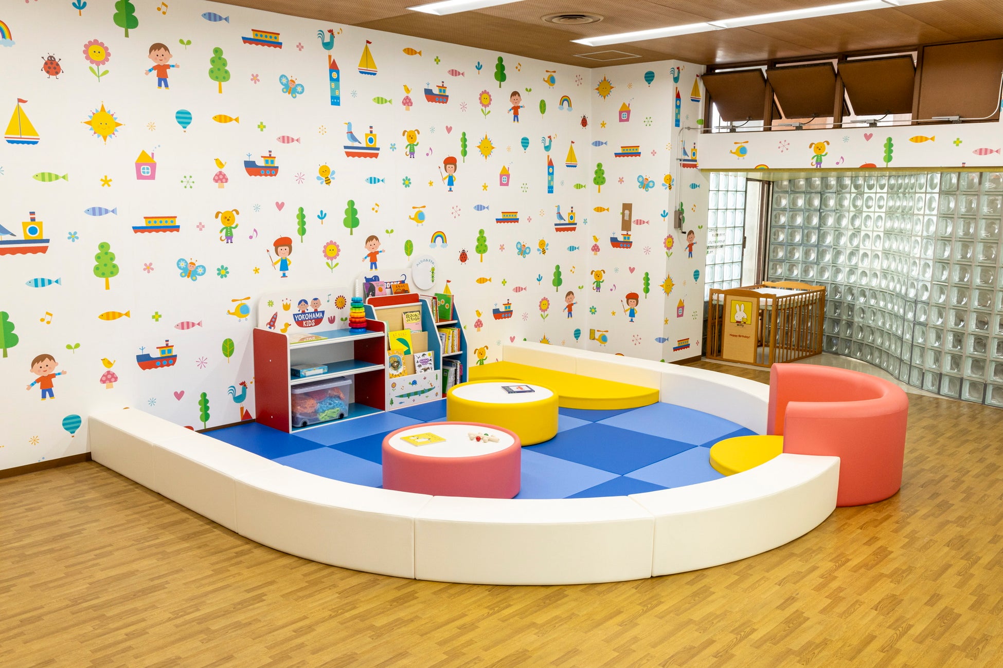 ・ 壁紙イラストから絵本コーナー全体のデザインまでを横浜市ゆかりの絵本作家 市原 淳(いちはら じゅん)氏がプロデュースし、ヨコハマをイメージした明るくカラフルな空間となりました。
