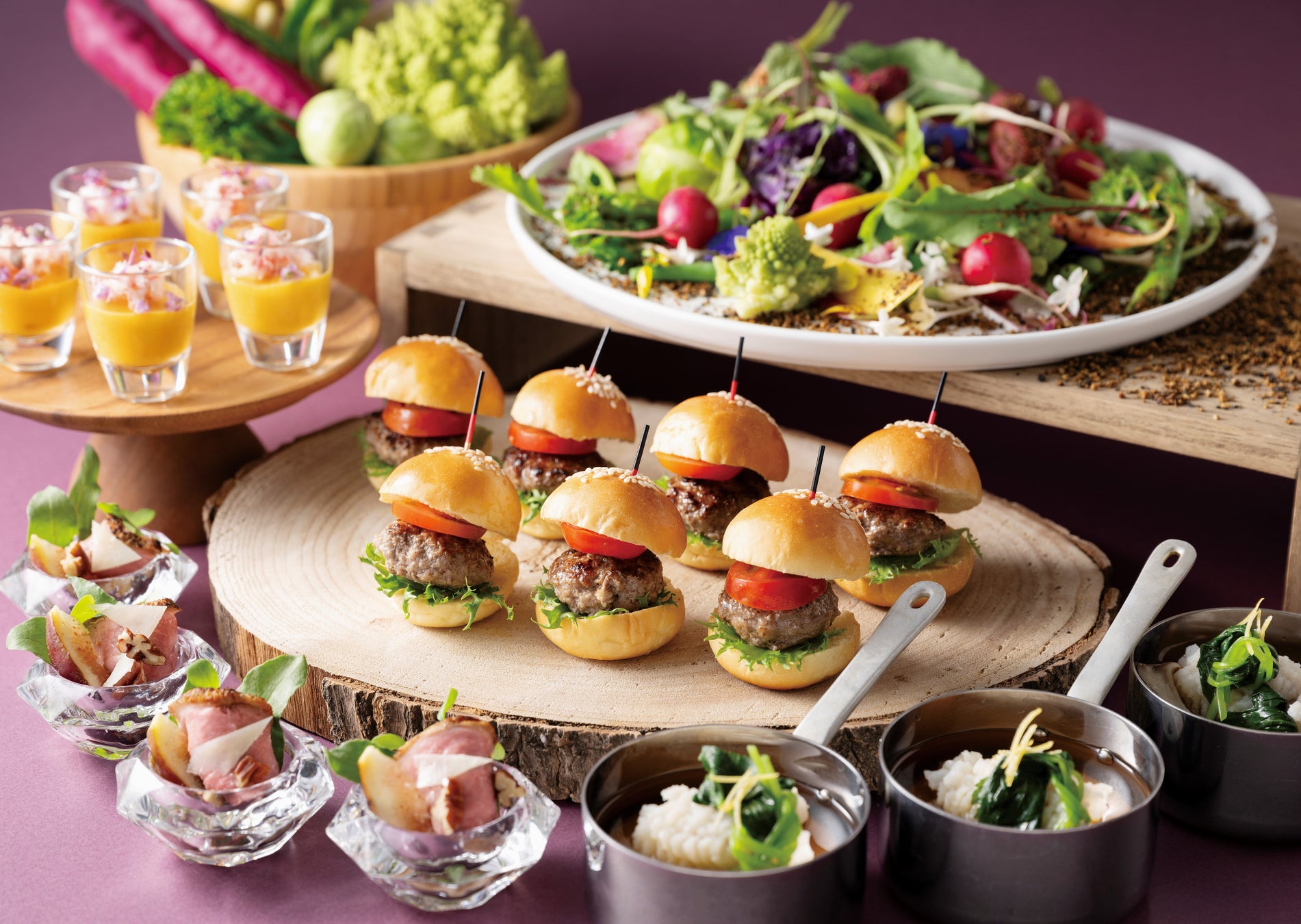 また、フードメニューには、淡路島産ビーフ100%で焼き上げたパティをサンドした「淡路産牛のミニバーガー」が登場。肉肉しい旨みあふれるパティが、バーベキューソースとの相性が抜群です。さらに、芳醇な松茸にふんわりと柚子が香る、秋のごちそう「鱧×松茸」や、じっくりと煮込んで旨みを引き出した「キノコたっぷりのコンソメスープ」など、秋ならではの食材を使用した和洋の本格メニューが並びます。