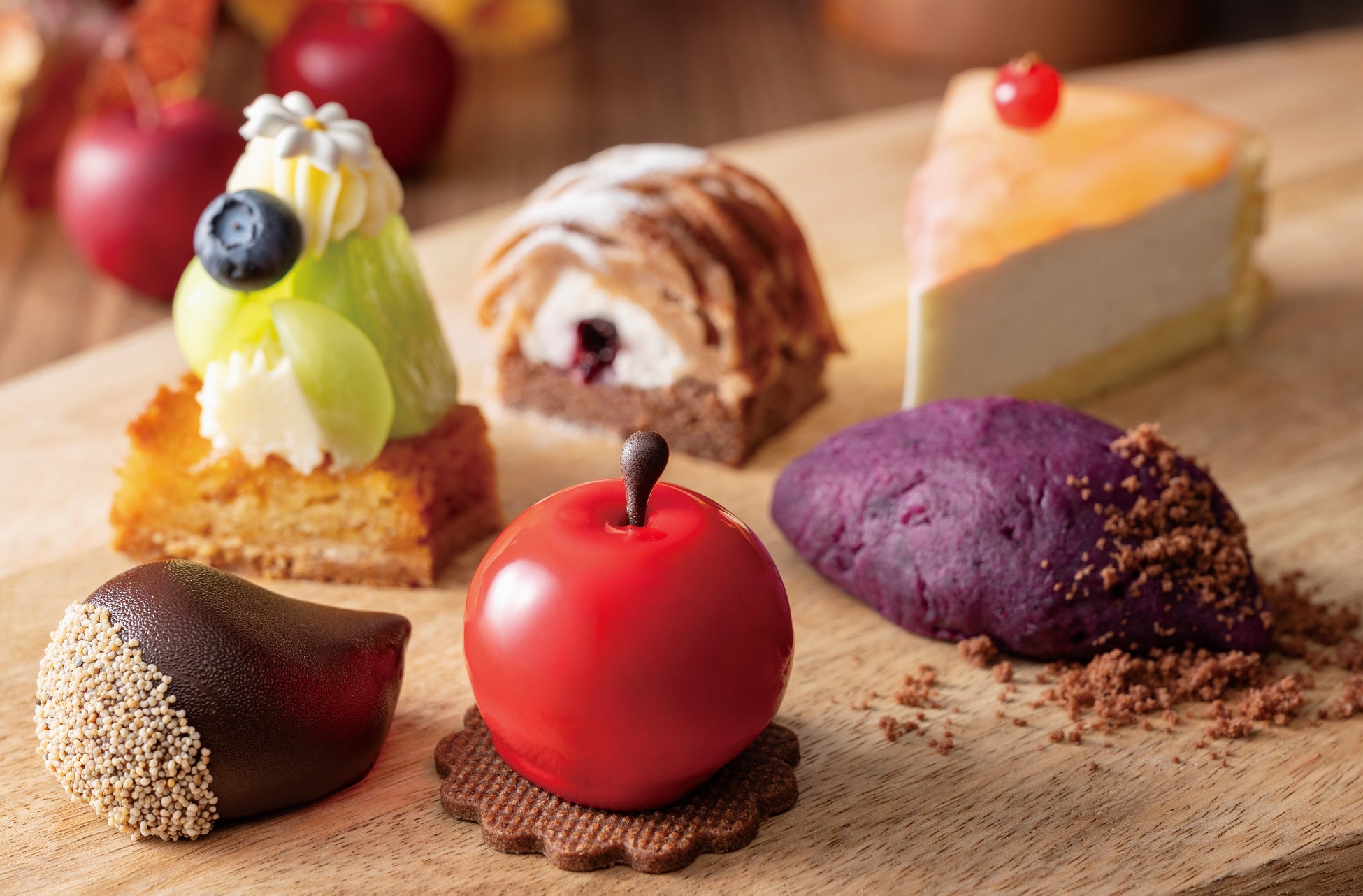 まんまるりんごムース / 栗に見立てたマロンバタークリーム / “芋掘り”スイートポテト / シャインマスカットのタルト / 秋色かぼちゃムース / 栗とカシスのモンブラン / 栗のショートケーキ / グレープジュレとブランマンジェ / マスカットジュレとブランマンジェ / 洋ナシとバニラのシャルロットケーキ / りんごとナッツのクランブルタルト / キャラメルバナナマフィン / ナッツのクラックチョコレート / 宇治抹茶「さみどり」のブラウニー など