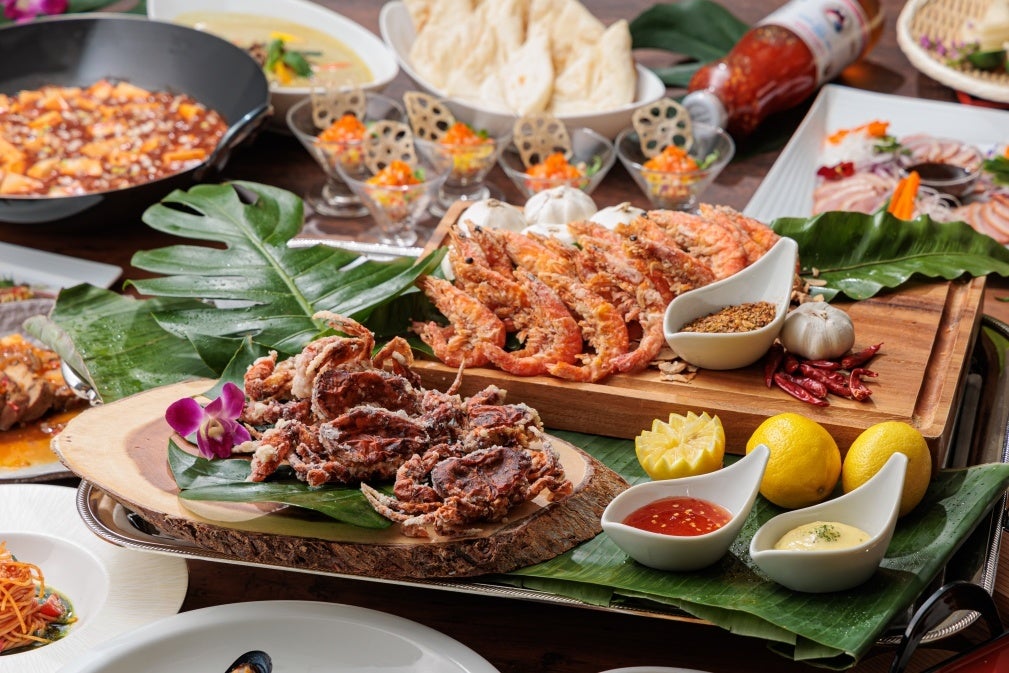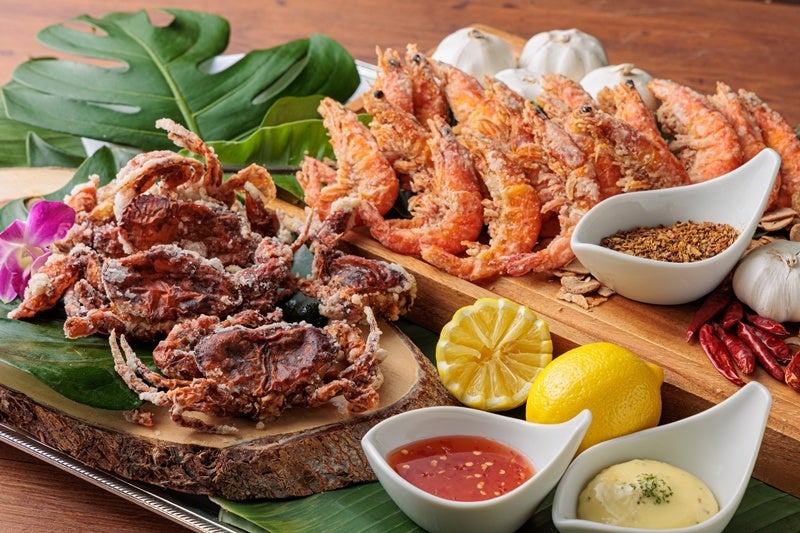 シェフのおすすめの「ガーリックシュリンプ&ソフトシェルクラブ コンディメント添え」をはじめ、世界各国の様々な料理のラインアップを揃えております。