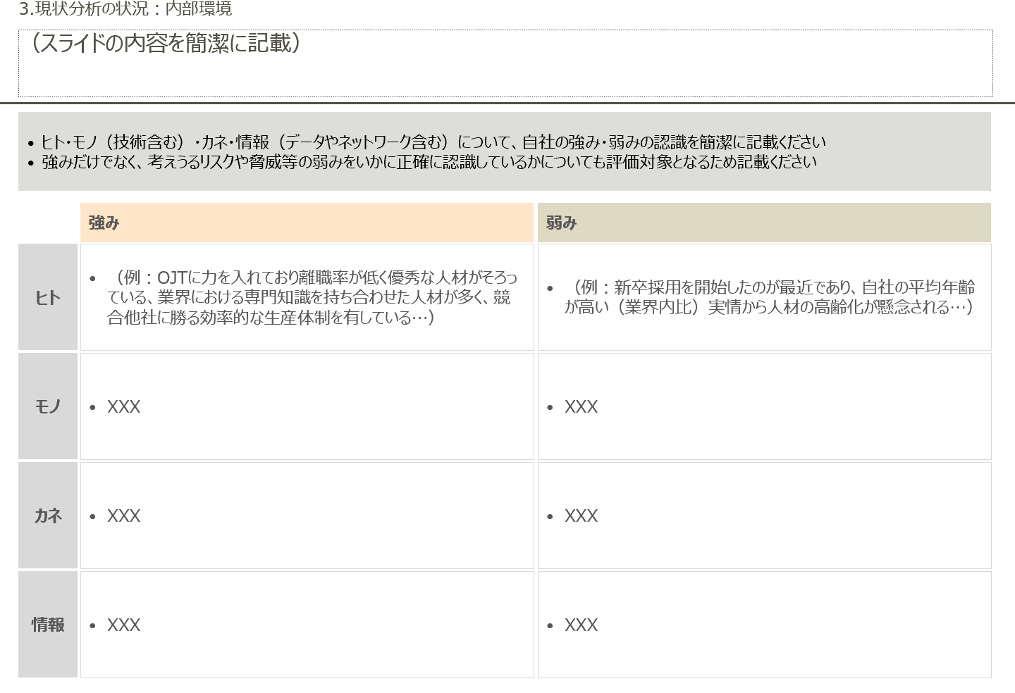 ①経営戦略の項目では、現状の外部・内部の分析が必要になります。根拠となる数字やデータも重要になり、これらは引用元も記載して根拠を明記させる必要があります。
