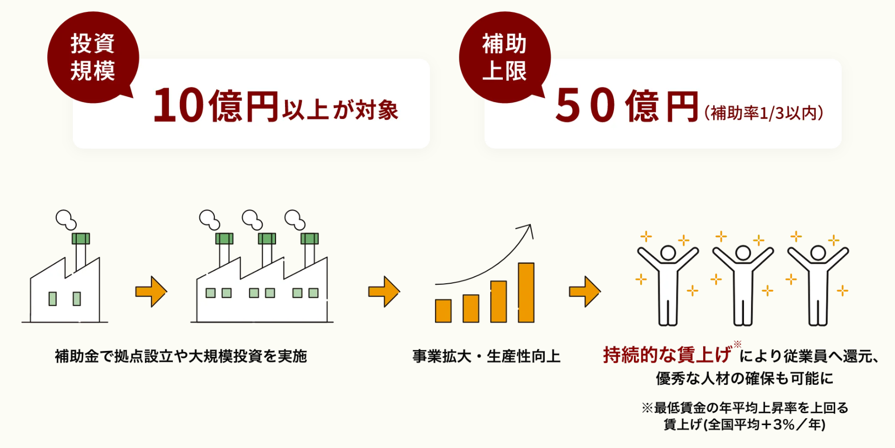 この補助金は、地域の雇用を支える中堅・中小企業が、足元の人手不足等の課題に対応し、成長していくことを目指して行う大規模投資を促進することで、地方における持続的な賃上げを実現することを目的としています。