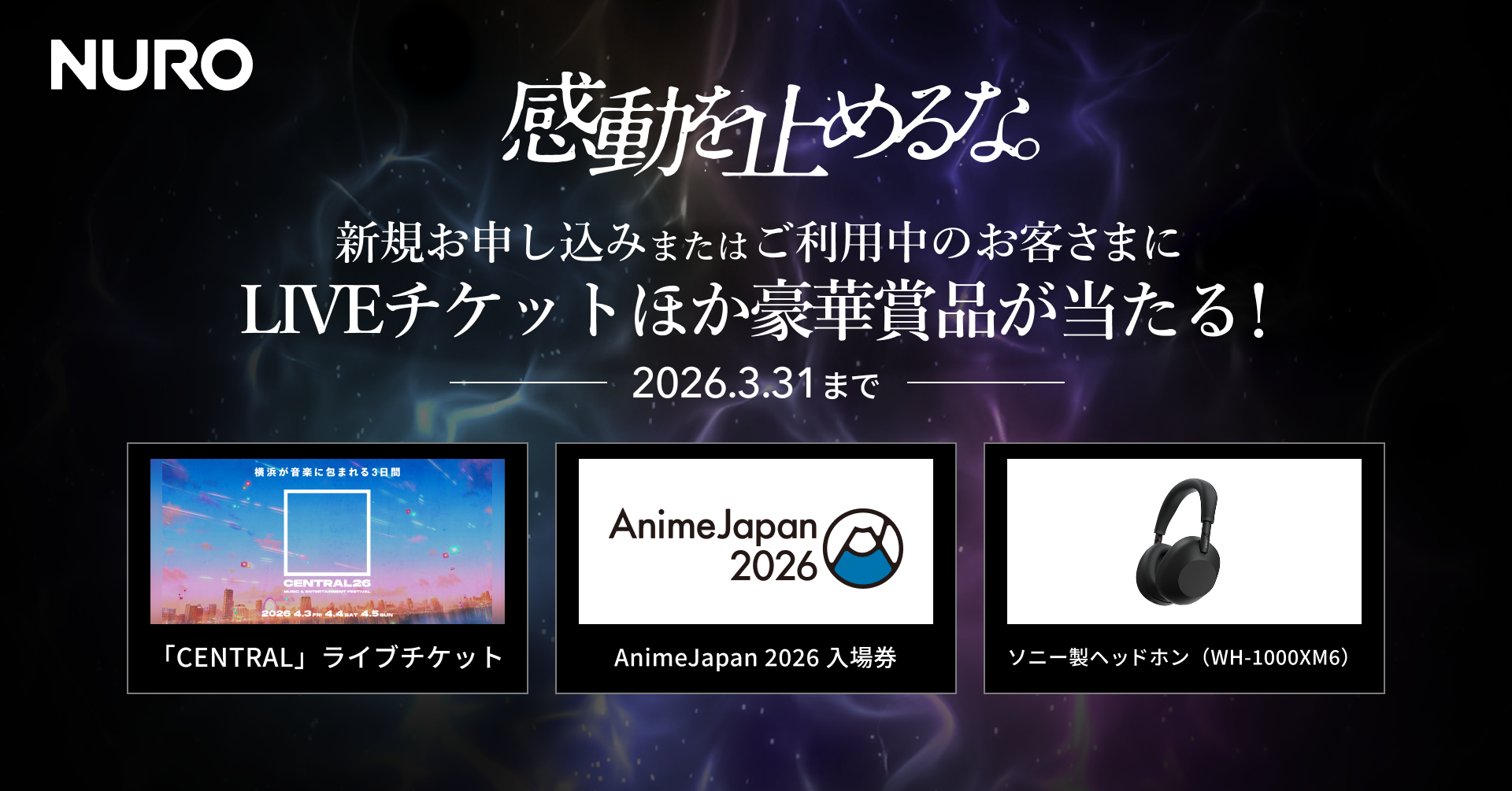 内容:期間中、「NURO 光」および「NUROモバイル」に新規で申し込んだ方または利用中の方を対象に、ちゃんみなほか様々なアーティストが出演する「CENTRAL MUSIC & ENTERTAINMENT FESTIVAL 2026」ライブチケット・「AnimeJapan 2026」入場券・ソニー製ヘッドホン(WH-1000XM6)を抽選でプレゼント。