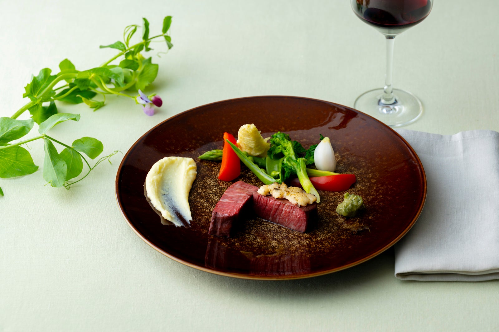 長野ワインが持つ繊細で奥深い味わいは、まさにエレガンスの極み。今回のディナーコースは、その魅力を最大限に引き出すペアリングの妙が光ります。その進化を象徴する一皿とワインの出会いに驚かされました。魚料理では昆布締めした甘鯛の繊細な旨みと、そばの実とごぼうのリゾットの香ばしさ。そこに赤かぶ甘酢漬けのブールブランソースのほのかな酸味が加わり、料理として完成された味わいを見せながらも、楠ワイナリーのピノノワール2020 スペシャル キュヴェがそれをさらに昇華させます。このワインぶどう産地の冷涼な気候ならではのエレガントな赤系果実のニュアンス、そして絹のように滑らかなタンニンが、甘鯛のふくよかな旨みと見事に調和し、和の技法とフレンチのエッセンスが融合した料理に、新たな表情をもたらします。これは単なるペアリングではなく、長野のテロワールが織りなす美食のアートともいえる一体感を得ました。さらに、信州プレミアム牛フィレと桔梗ヶ原メルロ2020のマリアージュも圧巻でした。じっくりと赤ワインでブレゼされた牛フィレの深いコクに、発酵食品クラストが繊細な旨みと複雑な香りを加え、そこに力強くも洗練された果実味とシルキーなタンニンが寄り添う。このペアリングは、まるでオーケストラのように調和し、余韻の長い感動をもたらします。長野の気候風土が生んだ食材とワインが、ここまでの高みに到達したことを実感できるディナー。ぜひ、この唯一無二の味わいを体験していただきたいです。