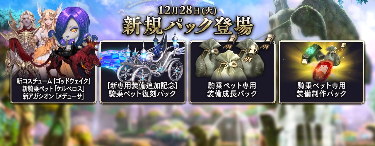 また、可愛さと妖艶さを併せ持つアガシオン「メデューサ」の追加や、三つ首の「ケルベロス」や「ウィンターチャリオット」、「クリスタルドルフィン」の3種類の騎乗ペットが新登場いたします。