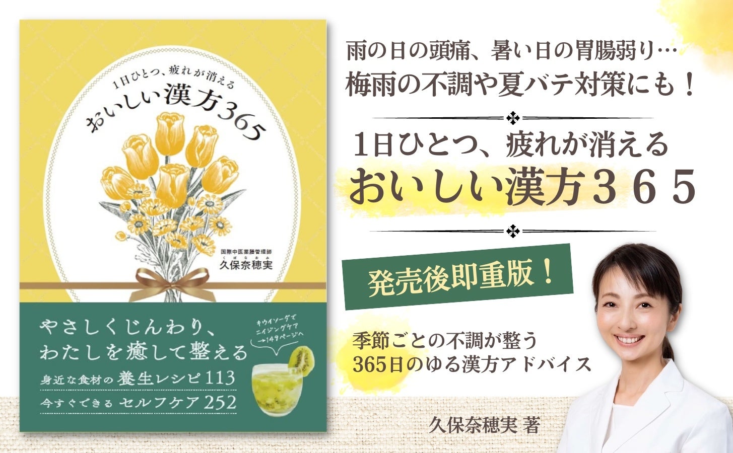 すぐに実践できる「やさしい漢方アドバイス」がSNSで大人気! ”なおみん”こと久保奈穂実先生による365日の漢方ハンドブック。身近な食材でカンタンに作れる「養生レシピ」113点と、今すぐ実践できる「セルフケア」のアイデアを252点収録した本書。発売前から予約が殺到し、4月22日の発売後、一週間たらずで即重版が決まりました。1日ひとつ読むだけで、季節ごとの不調が整っていく一冊です。