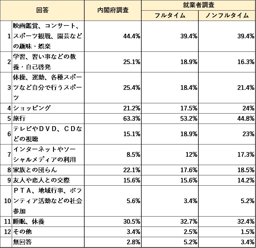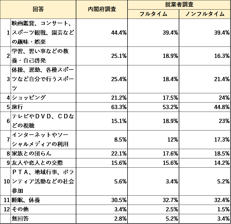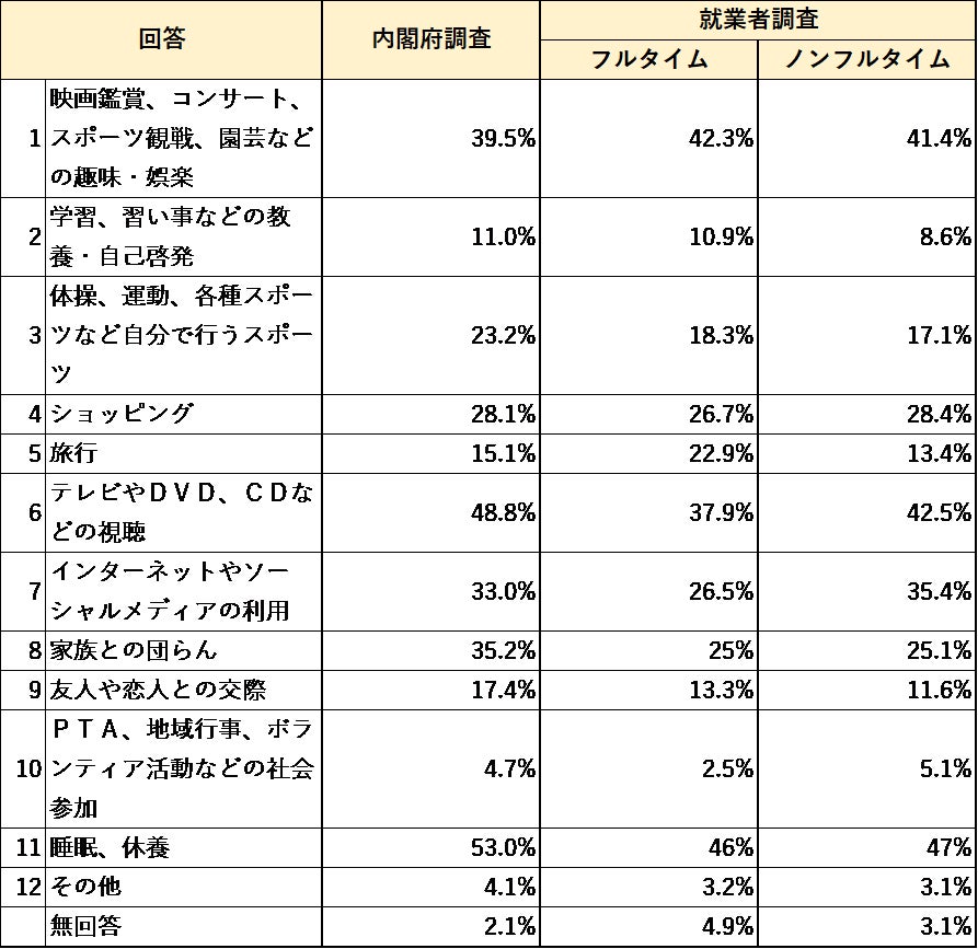 また、内閣府調査に比べ、フルタイム・ノンフルタイム共に就業者調査の方が「スポーツ」「家族との団らん」「友人や恋人との交際」「睡眠、休養」をあげる割合は低かった。