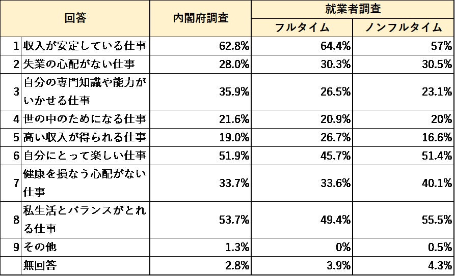 ■理想的な仕事については、内閣府調査・就業者調査ともに傾向はほぼ同様。フルタイム就業者は「収入が安定している」「高い収入が得られる」仕事を求める割合が高く、ノンフルタイム就業者は「健康を損なう心配がない」「私生活とのバランスが取れる」仕事を重視する傾向が伺える。