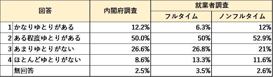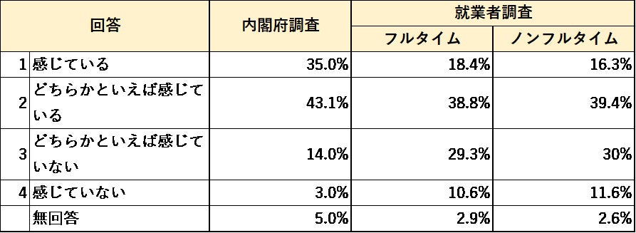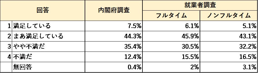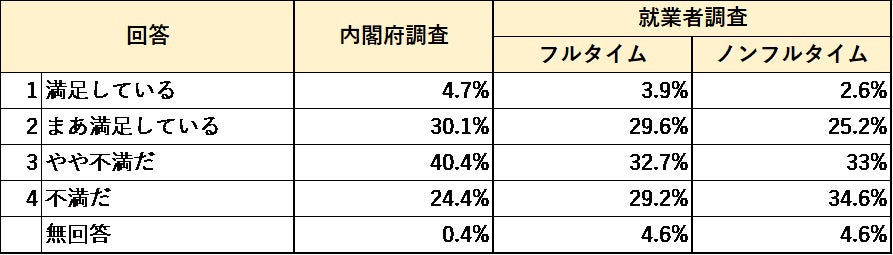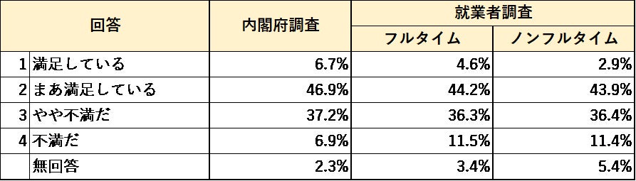内閣府「国民生活に関する世論調査」(以下「内閣府調査」)と同項目で、全国の働き手の全世代に対して、当研究所が独自の社会調査(以下「就業者調査」)を行ない、両者の調査結果の比較考察を行なった。両調査の違いとしては、当研究所の調査では対象を“就業者のみ”とし、年代と勤務形態(フルタイム・ノンフルタイム)を均等に設計しているのに対し、内閣府調査は就業中かどうかに関わらず対象をランダムに聴取したため、高齢者の回答割合が高いのが特徴。