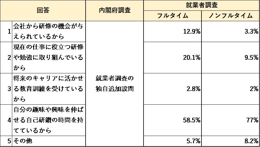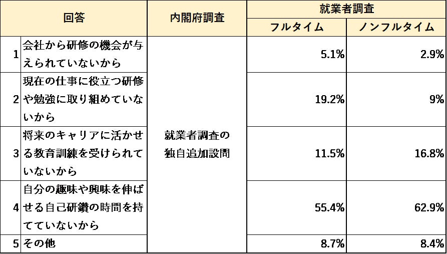 「自己啓発・能力向上」について、満足または不満と回答した理由を聞いたところ、フルタイム就業者は現在の会社や仕事に関連しているかどうか、またノンフルタイム就業者は自己研鑽の時間を持てているかが、回答結果に大きく影響を与えていることが分かった。生活の中で悩みや不安を感じているかを聞いたところ、就業者調査の方が悩みや不安を感じている人の割合が低かった。その内容については、内閣府調査では「家族」の健康や生活上の問題や「老後の生活設計」が多く、就業者調査では「自分」の生活上の問題が多かった。