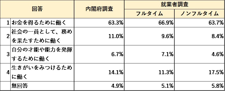 ■働く目的を聞いたところ、内閣府調査と就業者調査は同様の傾向だったが、ノンフルタイム就業者は「生きがいを見つけるため」とする割合が他より高かった。