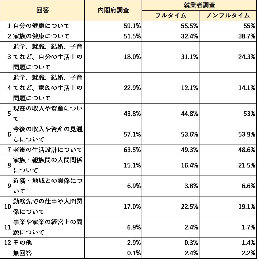 ■生活の中で悩みや不安を感じているかを聞いたところ、就業者調査の方が悩みや不安を感じる割合が低かった。その内容は、内閣府調査では「家族」の健康や生活上の問題や、「老後の生活設計」が明らかに高い結果となり、就業者調査では「自分」の生活上の問題が多かった。